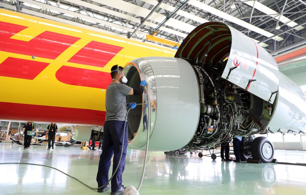 天津海特飞机工程有限公司工作人员在机库内进行维修作业。