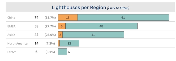 自2018年首次评选至今,全球“灯塔工厂”已累计达到172座,位于中国的工厂数量达到74家,占比43%。
